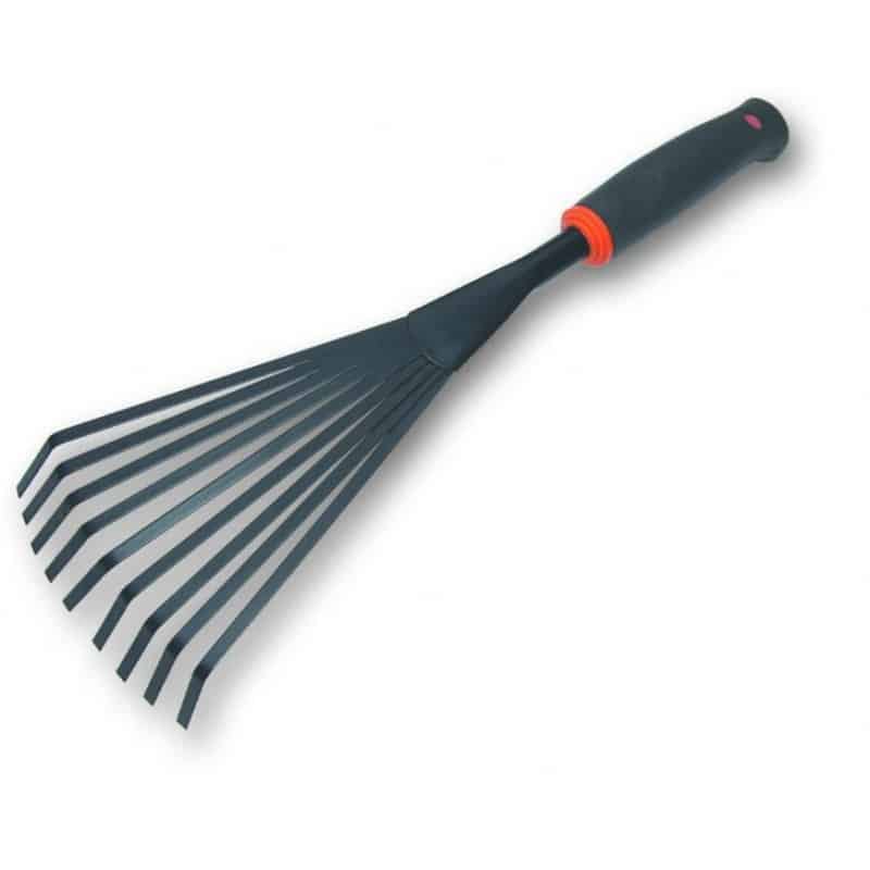 Μεταλλική τσουγκράνα-σκούπα με εύκαμπτους βραχίονες και πλαστική λαβή.
